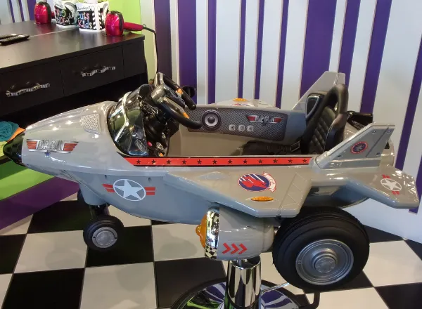 Why sit in a just a regular styling chair? At Sharkey's kids can sit in their choice of a fun car! Including a Fighter Jet, Police Car, Fire Truck, Frozen Jeep and more!